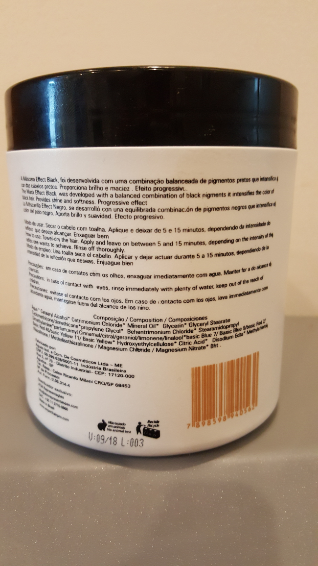 BLACK EFFECT MASK 500g The Mask Effect Black, was developed with a balanced combination of black pigments it intensifies the color of black hair. Provides shine and softness. Progressive effect How to use: Towel-dry the hair. Apply and leave on between 5 and 15 minutes, depending on the intensity of the reflex one wants to achieve. Rinse off thoroughly. - Additional Information