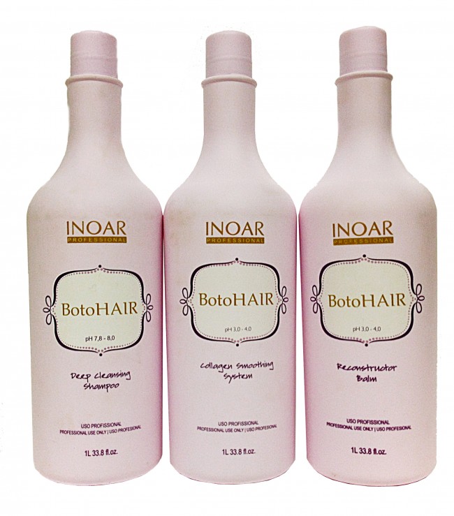 INOAR Professional created a unique treatment formula that smooth away wrinkles acting as hair fillers forming a protective layer around the hair’s cortex. This innovative formula is comprised of proteins and various glossing agents that provide luminous shine with a luxuriously silky feel. BotoHAIR has a phenomenal ability to reduce up to 95% of frizz and make curly hair easier to manage with its improved texture, even after its first use. HOW TO USE BOTOHAIR KIT Deep Cleansing Shampoo(Step 1) Gently shampoo the hair with the BotoHair Deep Cleansing Shampoo, managing it for approximately 5 minutes. Rinse thoroughly. Repeat the process if necessary. Collagen Smoothing System(Step 2) Mix one measure of BotoHair Collagen Smoothing System with two measures of the BotoHair Reconstructor Balm and mix thoroughly. Divide the hair into 4 parts and apply the product on small sections of hair from scalp to ends, starting at the nape of the neck, keeping 1/2 inch off the scalp area. Let it set for 10 minutes. Blow-dry the hair 100%. Divide the hair into 4 parts and flat iron 3 to 5 times in thin sections. Rinse